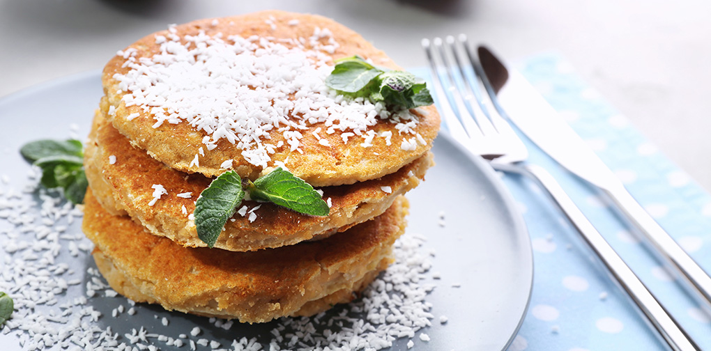 • Fruta de tu preferencia • Pancakes de coco y canela con sirope sin azúcar